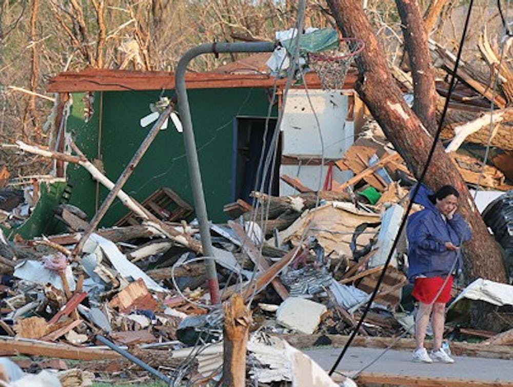 ** ALTERNATE CROP ** An unidentified woman contemplates the damage from a tornado that ripped through the city of Picher, Oklahoma May 10, 2008. At least six people were killed as the tornado flattened the northeastern Oklahoma town of Picher before the funnel struck about 15 miles away near Seneca, Mo., and killed at least three, authorities said. The tornado in Picher _ a depressed and pollution-scarred mining town that many residents had already fled _ caused major damage in a 20-block area, Emergency Management spokeswoman Michelann Ooten said. (AP Photo/courtesy Sheilah Miller)