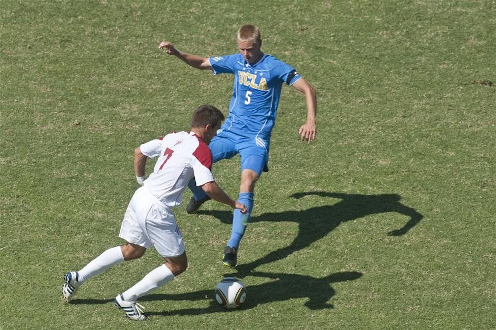 Freshman midfielder Harrison Petts dribbles past UCLA's Andy Rose during IU's 5-1 victory against UCLA on Sunday at Bill Armstrong Stadium.