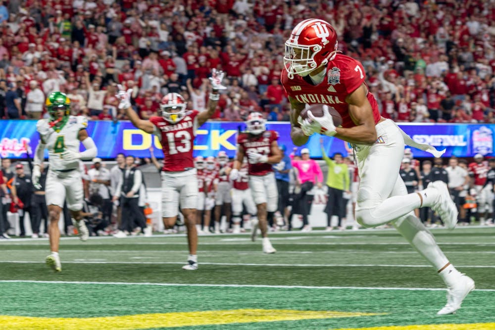 Sixth-year senior E.J. Williams Jr. scores a touchdown during the CFP Semifinal game against Oregon on Jan. 9, 2026, at Mercedes-Benz Stadium in Atlanta. Williams had 13 receiving yards in the game. Briana Pace