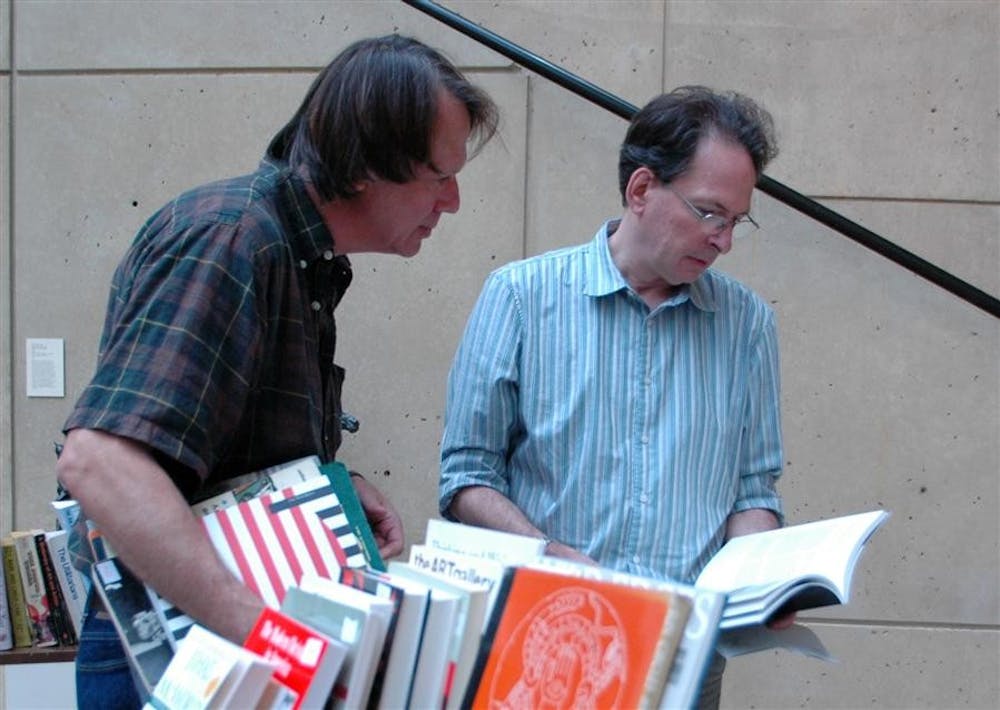 Fine arts professor Tim Kennedy looks at a book on sale at Decorate Your Digs on Wednesday afternoon at the IU Art Museum. The event was a collaboration of the IU Art History Association and the IU art museum's works-on-paper department.