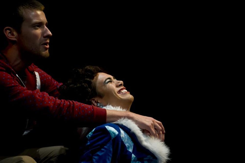 Junior Cosmo Clemens (center), playing Angel, and senior CJ Pawlikowski, playing Tom Collins, perform during a dress rehearsal of RENT on Monday at the Ruth N. Halls Theatre. Peter Stevenson