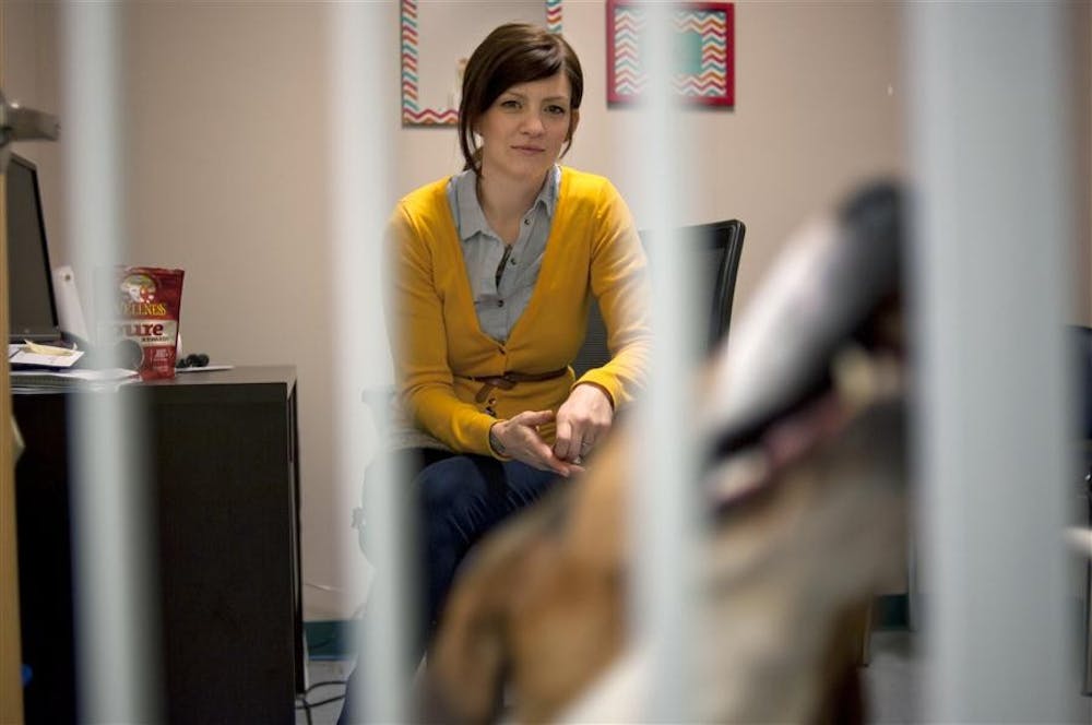 Emily Herr watches as Allanah tries to sniff a cat throw a dog gate Saturday morning in Bloomington, Indiana. Mark Felix