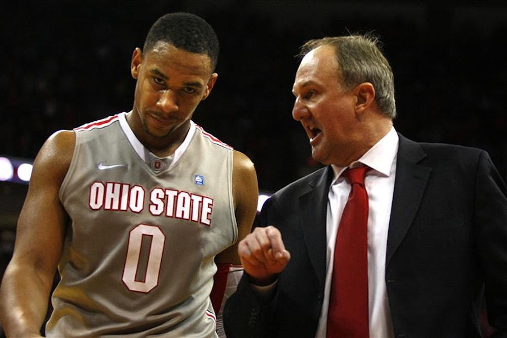 Ohio State forward Jared Sullinger talks to coach Thad Matta on Sunday at Value City Arena. Mark Felix
