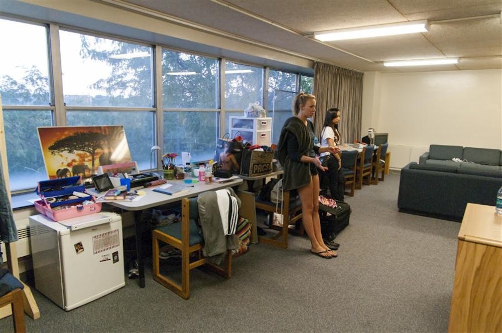 Freshmen Carson Nestler and roommate Sara Jallal hang out in their lobby turned dorm room Thursday. They, along with two other roommates, had just left a meeting where they found out they were being separated into normal rooms.