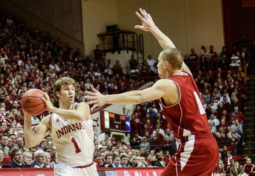 Senior guard Jordan Hulls looks to pass the ball during the Hoosiers' 59-64 loss to Wisconsin Tuesday at Assembly Hall. Steph Langan