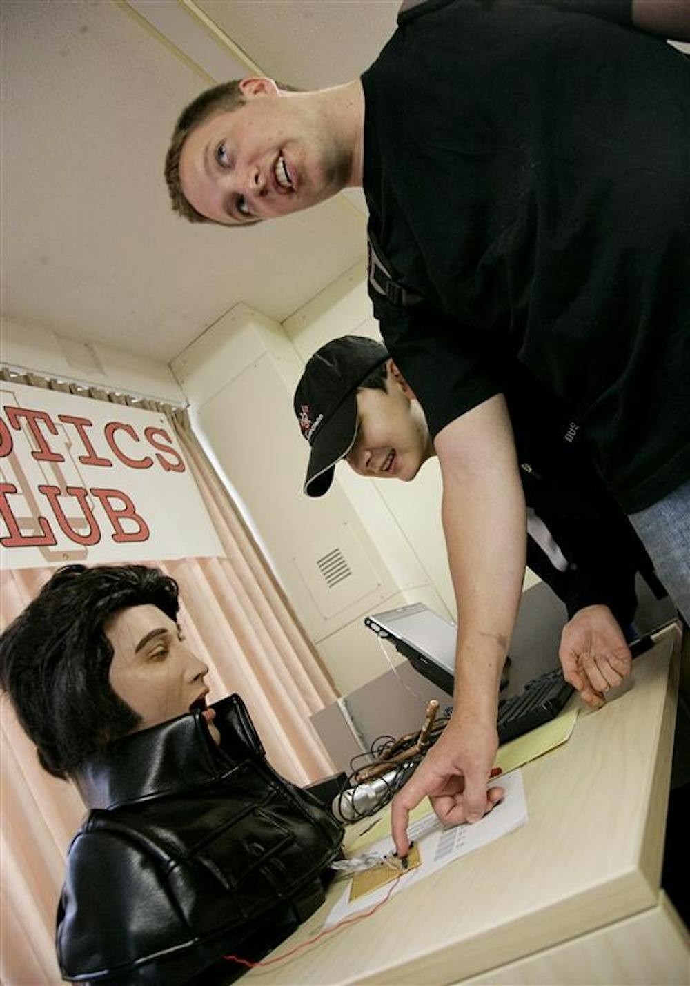 First-year graduate students Michael Potter and Farkhat Yussupjanov test an Elvis robot Friday afternoon at the Robotics Club Open House in Eigenmann Hall. The robot had 16 degrees of freedom, and allowed people to play with the expression of the robot by pushing various buttons.