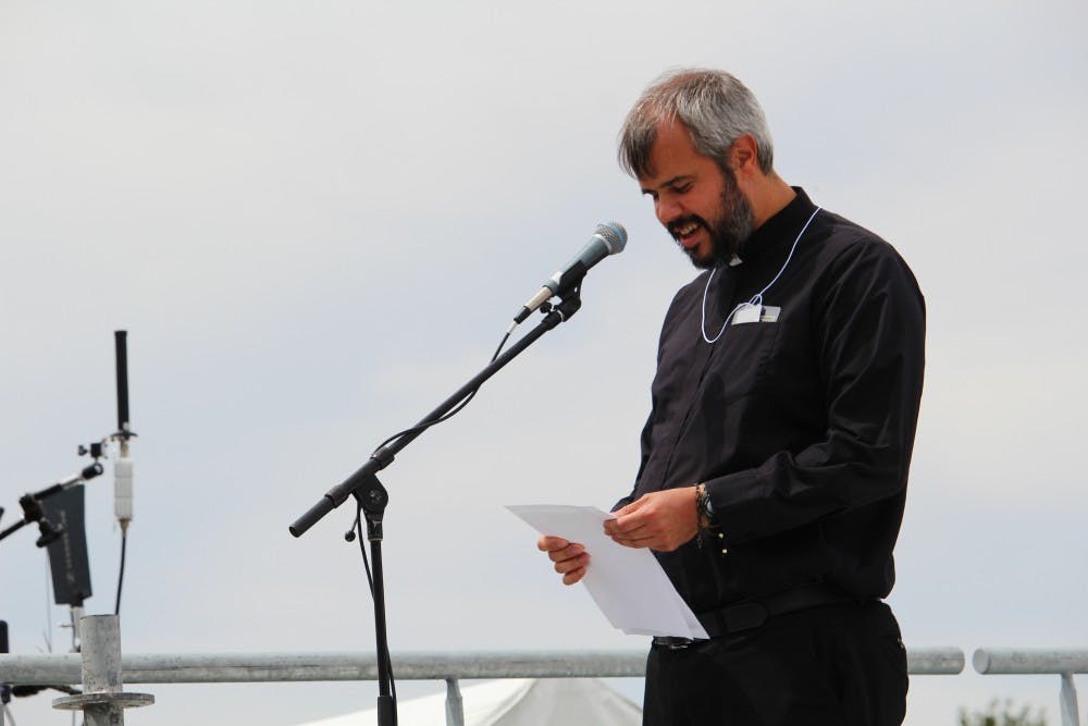 Father Joseph Minuth gives opening remarks and leads the crowd in a moment of silence before the start of the men’s Little 500. Minuth also spoke at the women’s Little 500 on Friday, April 20, the day before. Matt Begala