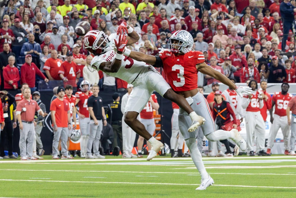 Redshirt junior wide reciever Omar Cooper Jr. attempts to catch the ball during the Big Ten Championship game against Ohio State on Dec. 6, 2025, at Lucas Oil Stadium in Indianapolis. Cooper did not appear in the game after that play.