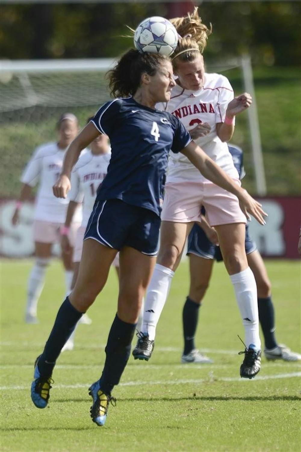 Senior forward Carly Samp and Penn defender Lexi Marton simultaneously head the ball during the Hoosiers' 3-0 loss to Penn Sunday at the Bill Armstrong Stadium. Steph Langan