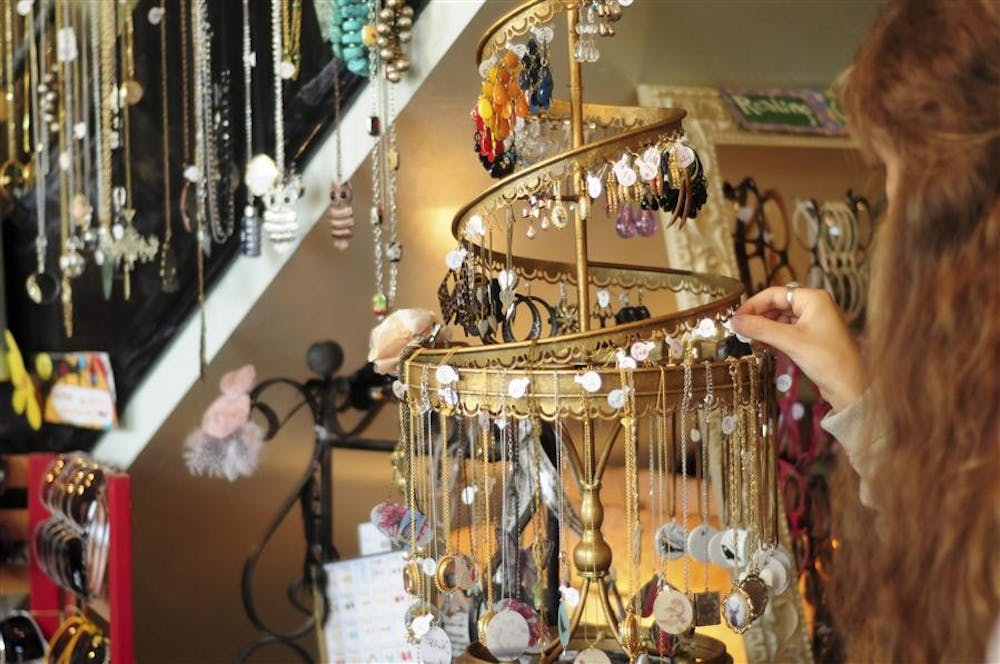Sophomore Panagiota Doukas inspects a pair of earings on Saturday at Cactus Flower. Cactus Flower, located at 322 E. Kirkwood Avenue, sells women's clothing, shoes and accessories downstairs and upstairs sells vintage clothing, shoes and accessories for both women and men.