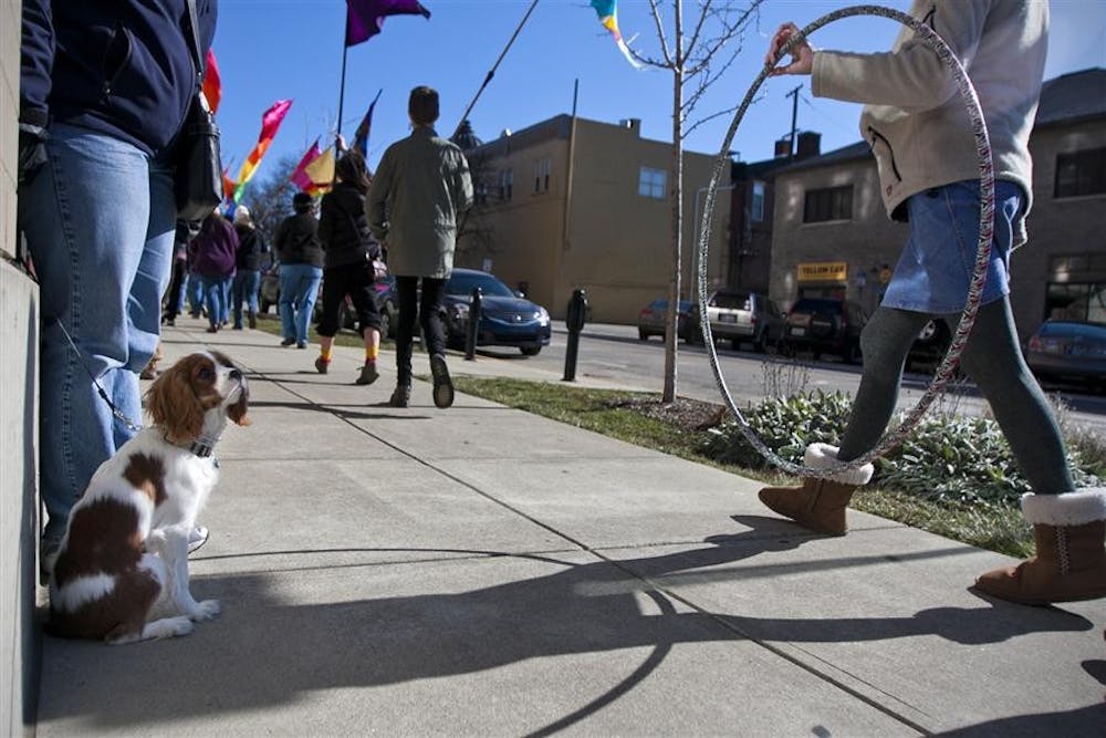 Clark, a King Charles Spaniel, watches as Jaenne Smith hula hoops Saturday during the PRIDE Film Festival Festive Walk in downtown Bloomington. The festival has been going on since 2004.