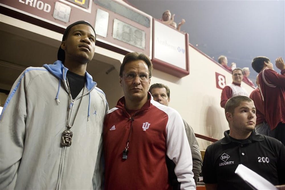 IU coach Tom Crean and recruit Jeremy Hollowell head to the floor of Assembly Hall on Oct. 22, 2010 at Hoosier Hysteria. Hollowell, from Lawrence Central High School in Indianapolis, is the No. 39 overall recruit in the Class of 2012.