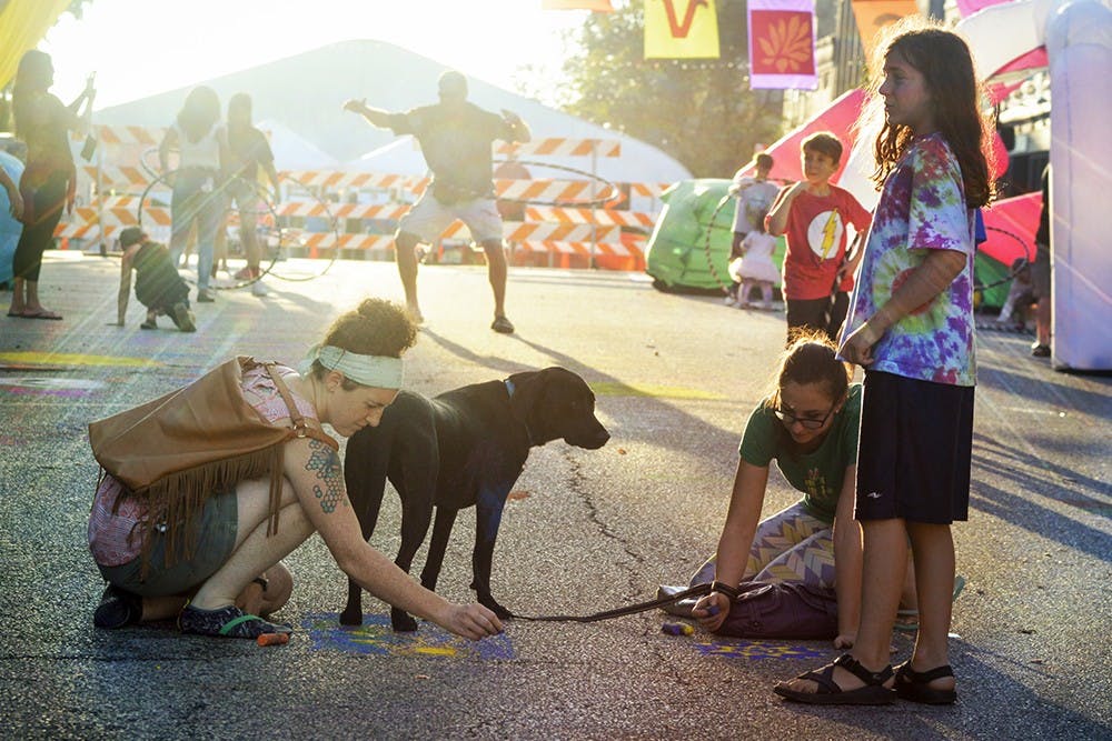Bloomington residents Ashley Mohler and Felicity Young hang out with their dog Lily and chalk the streets of Bloomington during this year’s Lotus World Music & Arts Festival held this weekend throughout downtown Bloomington. The festival contained 8 venues, over 30 International Artists, and as the headline states “1 Unforgettable Experience”.