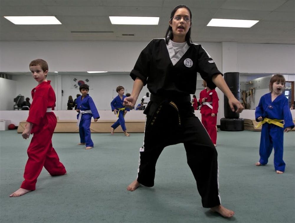 Senior Danielle Guevara leads a 6-10 year old karate class through basic punches and kicks Tuesday at Monroe County Martial Arts. Mark Felix