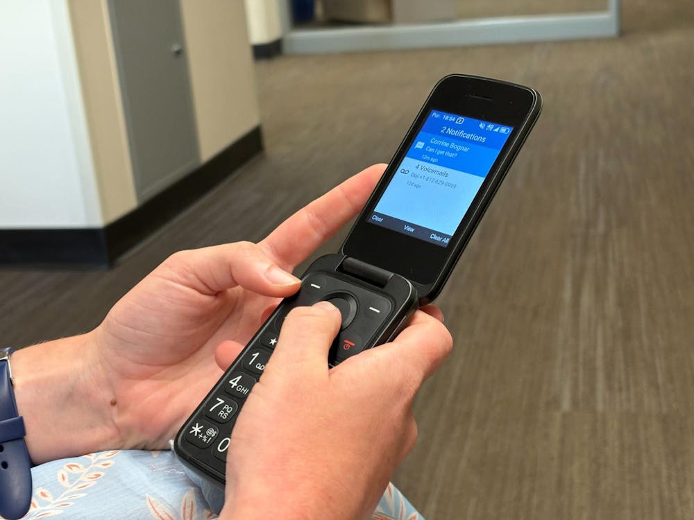 IU junior Gretchen Forcum shows off her flip phone Oct. 2, 2025, in Franklin Hall in Bloomington. Forcum switched to a flip phone last Thanksgiving break after realizing how much time she spent on social media.