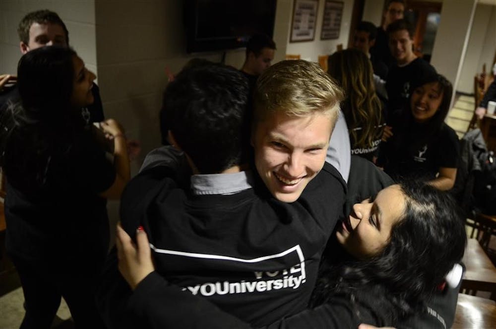 Michael Roederer co-chief of morale and members of YOUniversity smile and hug each other after hearing election results on Wednesday at Beta Theta Pi. YOUniversity has been working together on the campaign since January.