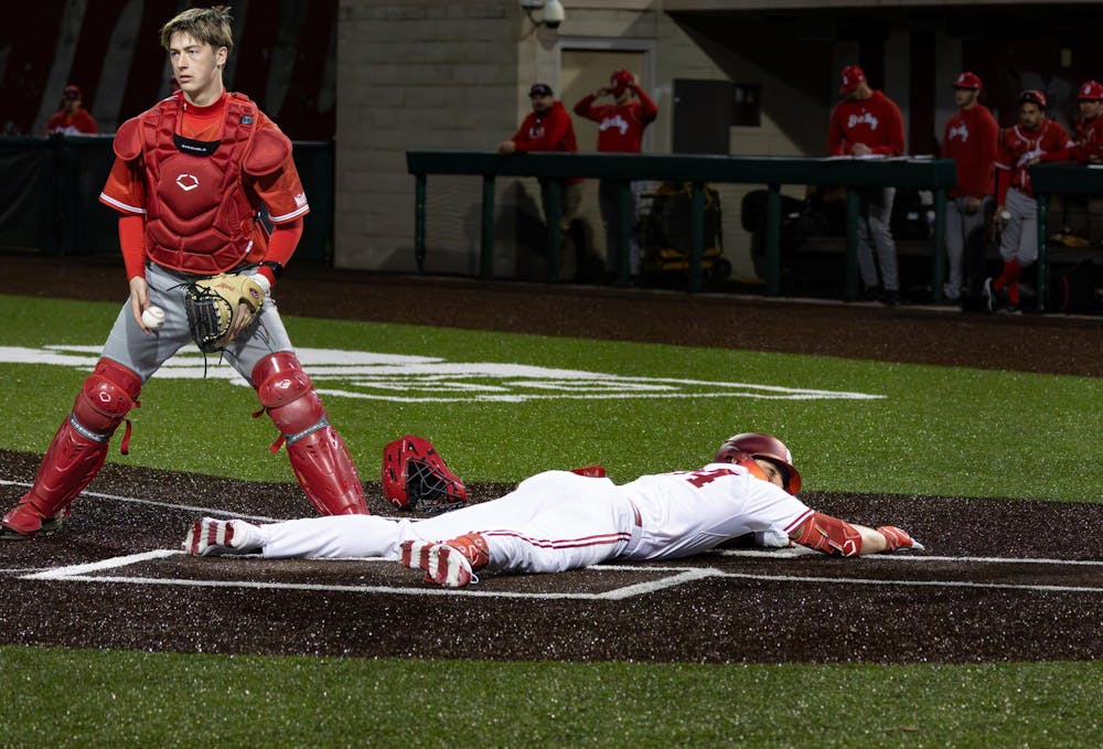 Sophomore infielder Jake Hanley slides into home during the game against Bradley University on Feb. 17, 2026, at Bart Kaufman Field in Bloomington. Hanley had three RBI's in the game. Sophia Kaplan