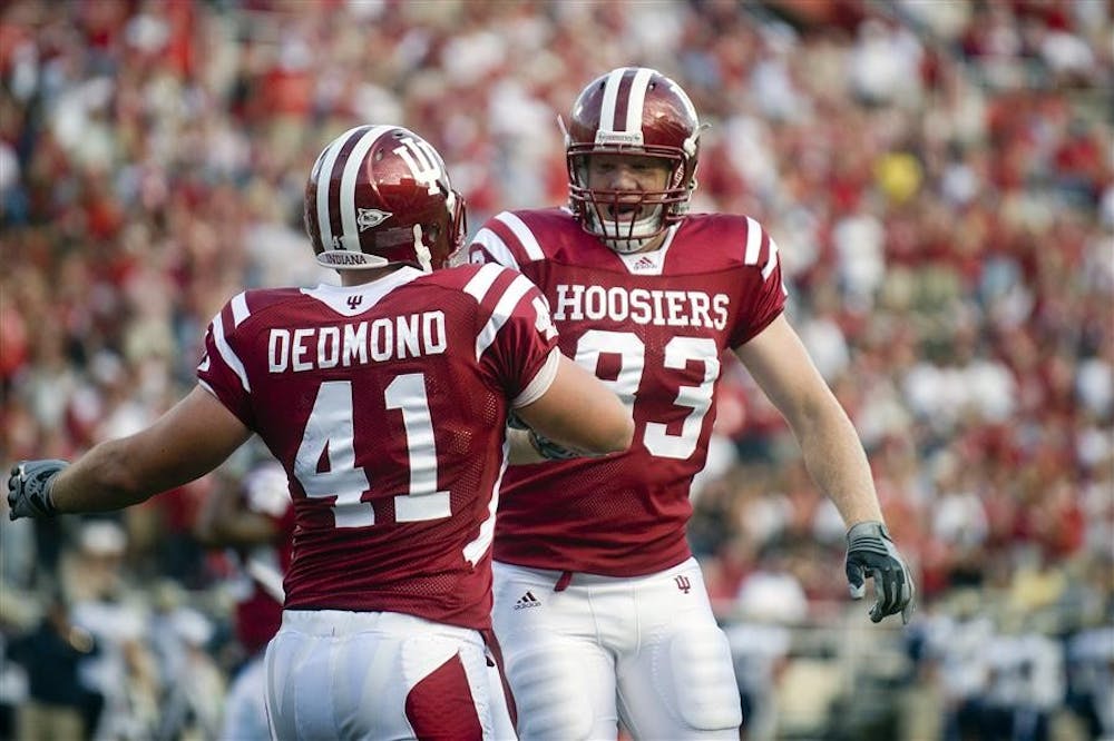 Junior tight end Max Dedmond and freshman tight end Ted Bolser celebrate Bolser's second touchdown during IU's 35-20 win against Akron on Sept. 25 at Memorial Stadium. Bolser's two touchdowns brought him to four on the season, which ties for the most catches by an IU tight end in a season since 1979.