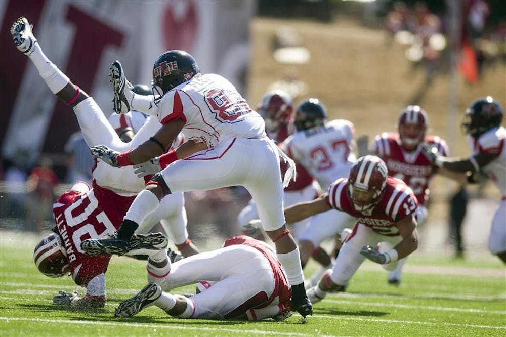 Defensive back Lawrence Barnett is upended by Arkansas State defenders during IU's game against the Red Wolves on Saturday at Memorial Stadium. Peter Stevenson