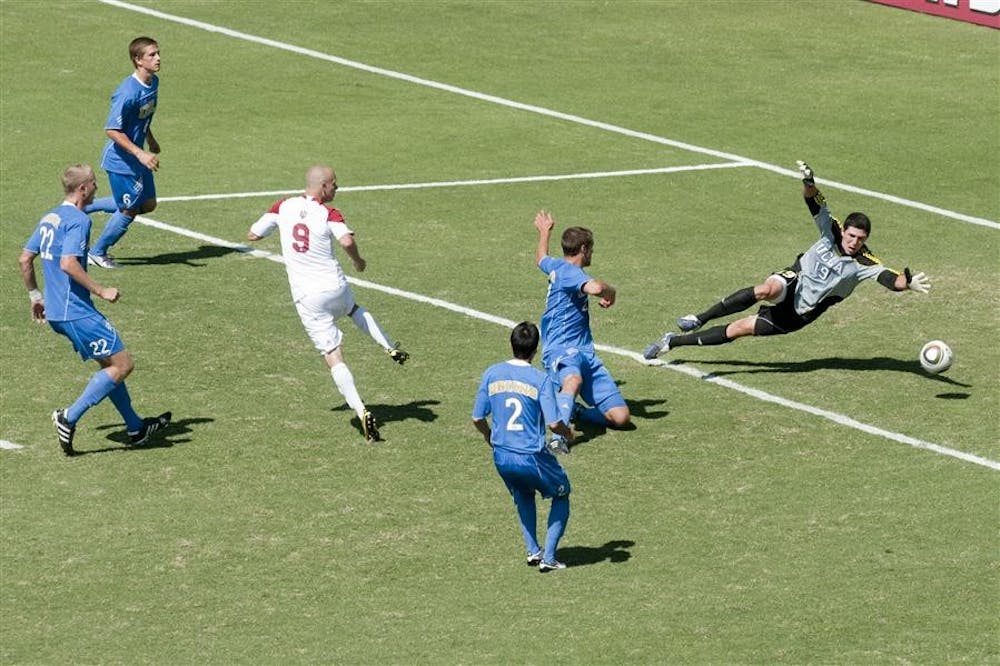 UCLA defenders look on as junior forward Alec Purdie's shot goes past UCLA goalkeeper Brian Rowe and into the net for IU's third goal. The Hoosiers beat the Bruins 5-1 Sunday at Bill Armstrong Stadium.