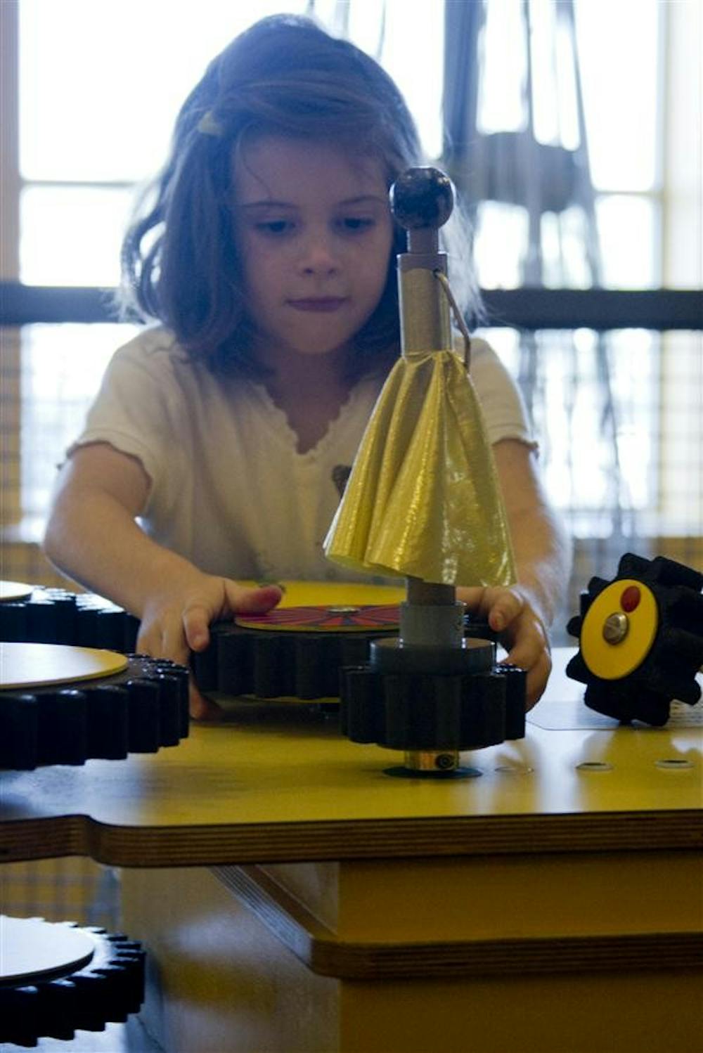 7 year-old Campbell Coverdale plays with gears Wednesday at the Toys: The Inside Story exhibit at Wonderlab Museum. The exhibit is open until September 4. Steph Aaronson