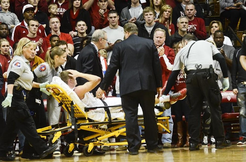 Sophomore forward Austin Etherington is wheeled away on a stretcher after getting injured during the Hoosiers' 100-69 win against Central Connecticut State on Saturday at Assembly Hall.