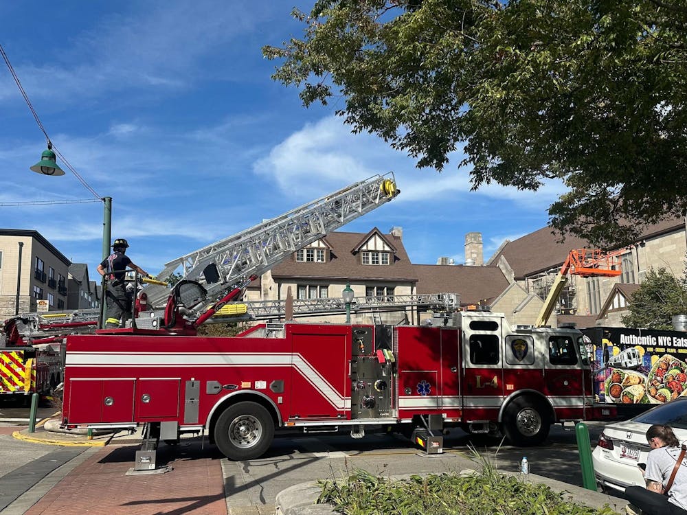 A Bloomington Fire Department truck sits in front of First Christian Church at 205 E. Kirkwood Ave. on Oct. 1, 2025, in Bloomington. Max Litwin, BFD's deputy fire chief, said nobody was injured in a fire at the church. Dalton James