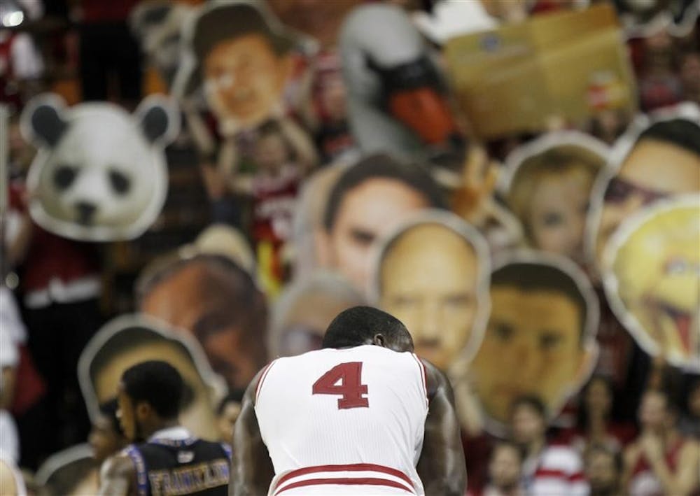Junior guard Victor Oladipo waits as a Coppin State player thows his free throws while fans hold the "big heads" during the game against North Carolina on Dec. 1, 2012, at Assembly Hall. IU won 87-51.