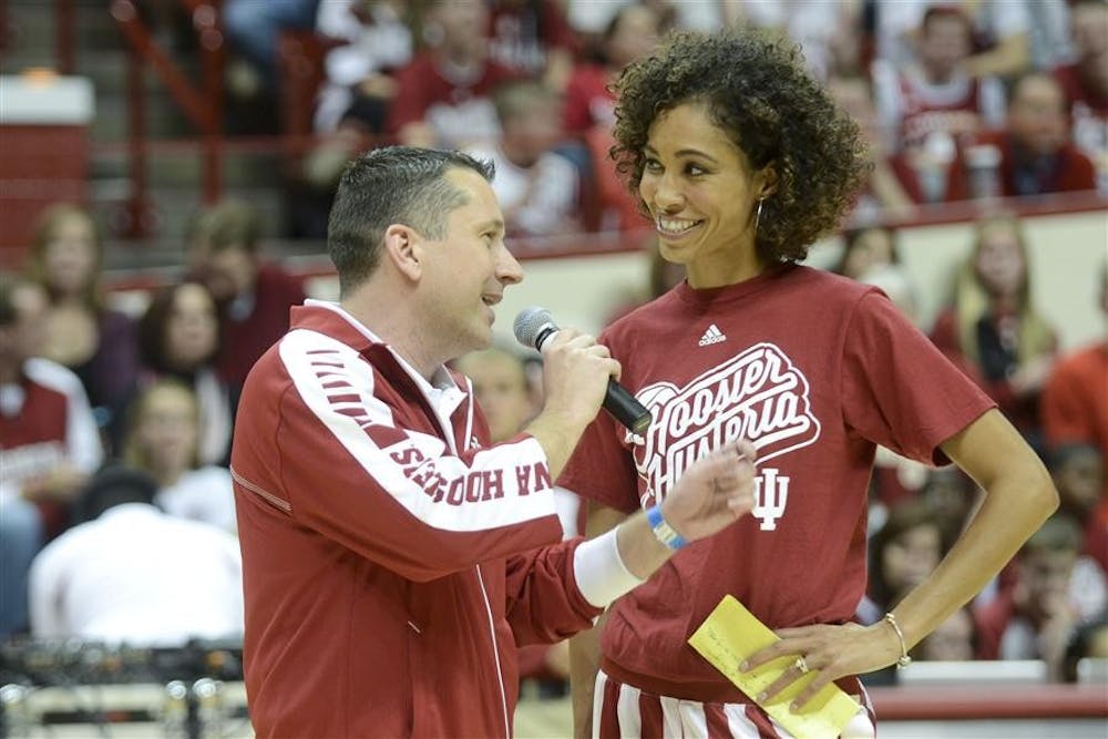New women's basketball head coach Curt Miller talks with emcee Sage Steele on Saturday at Hoosier Hysteria. Steph Langan