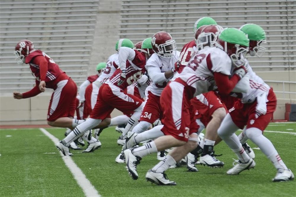 Members of the football team do a practice drill Saturday at Memorial Stadium. Steph Langan