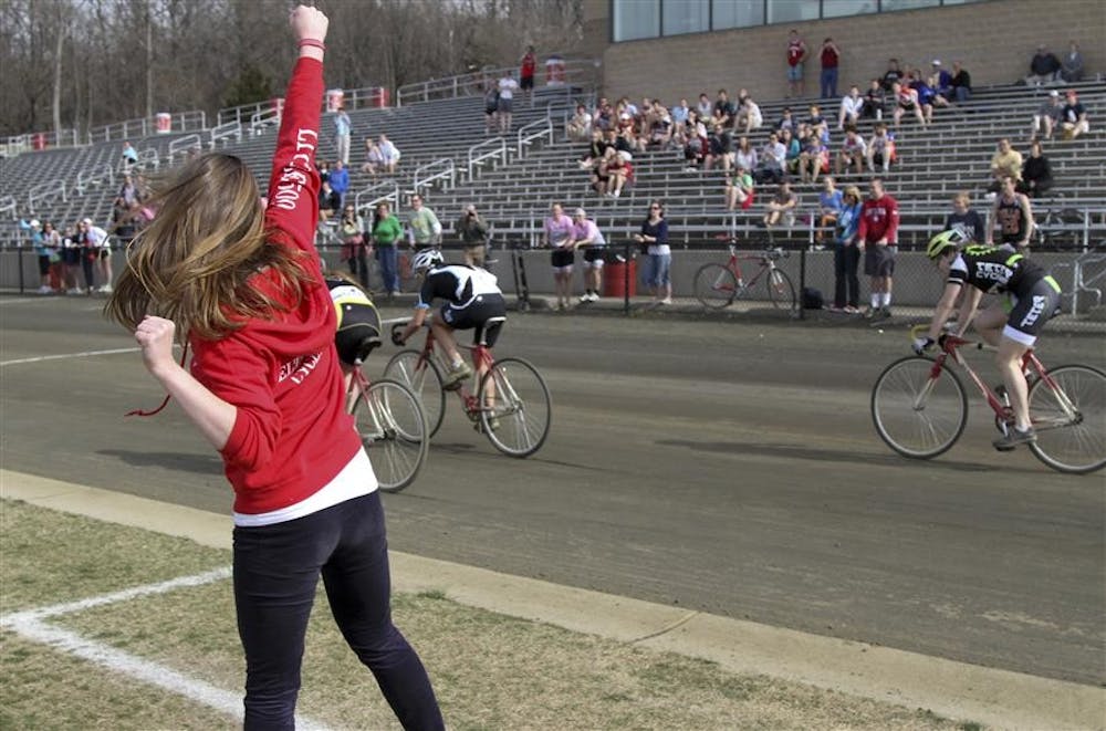 A Delta Gamma fan cheers as Kayce Doogs, of the Delta Gamma Cycling team wins the women's Little 500 Miss-N-Out on Saturday at Bill Armstrong Stadium. Steph Aaronson