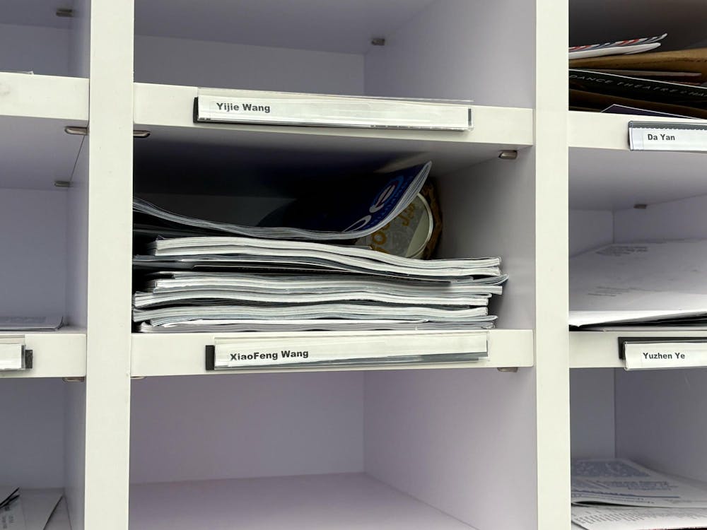 IU professor Xiaofeng Wang's mailbox is pictured April 3, 2025, at Luddy Hall in Bloomington. IU terminated Wang on March 28, the same day the FBI raided his home for unknown reasons.