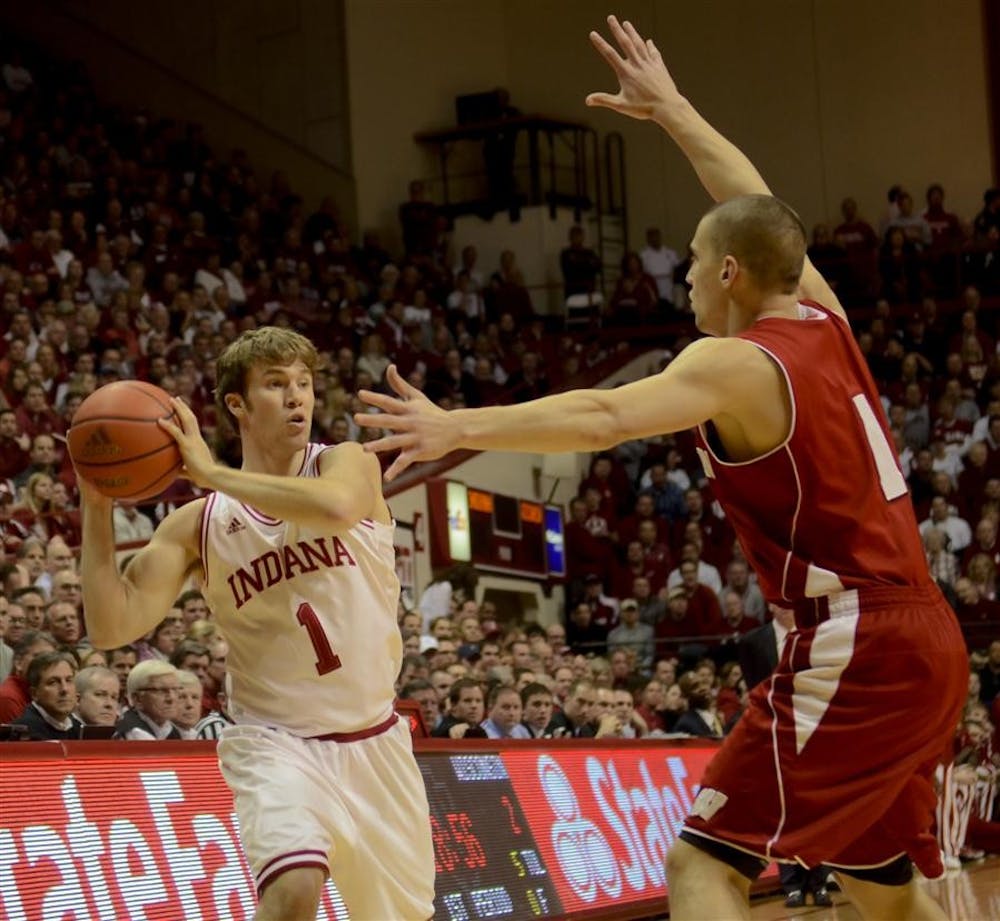 Senior Jordan Hulls looks to pass to a teamate before halftime against Wisconsin on Tuesday evening at Assembly Hall Steph Langan