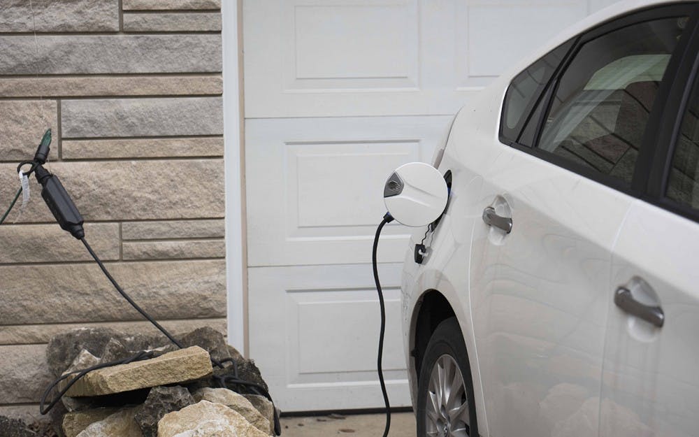 Jim Cripe charges his Prius on Sunday from the energy collected from the solar panels on his roof. The battery holds aabout 11.4 miles worth of power, which allows Cripe to commute to work on solar energy alone.