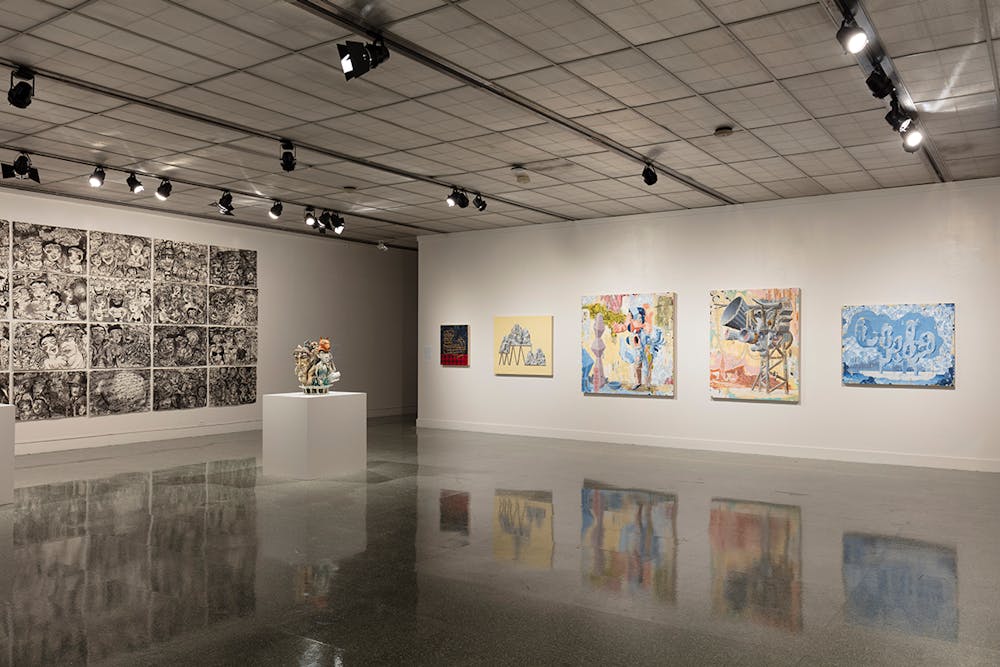 Artworks in the "Re:Visit | Celebrating a Decade of McKinney Visiting Artists" exhibition are pictured Oct. 31. The exhibition is currently on display at the Grunwald Gallery of the Eskenazi School of Art and Design, and will close this weekend.