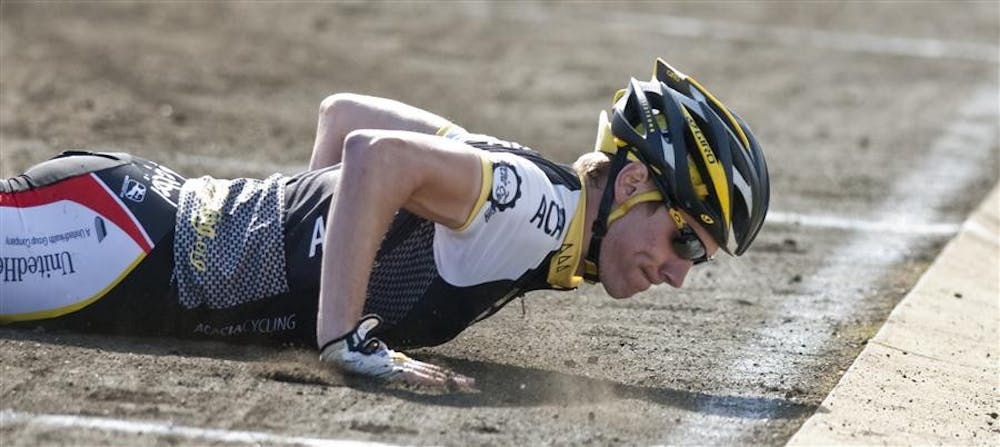 An Acacia rider reflects after failing to complete an exchange during Little 500 qualifications. Acacia eventually successfully qualified 22nd with a time of 2:31.77. Peter Stevenson