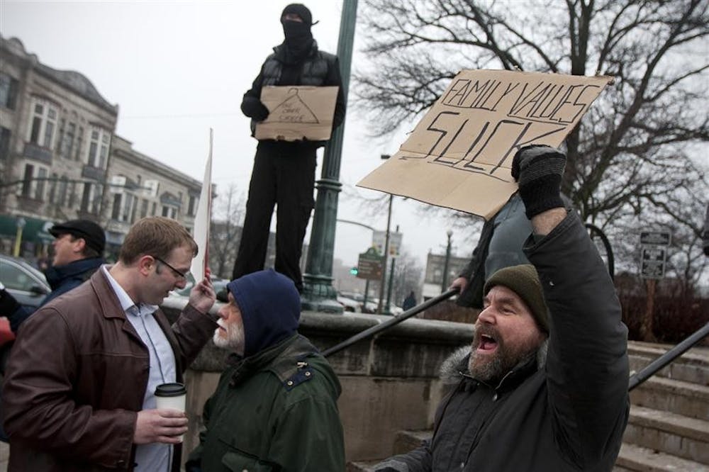 Michael Foster (left) and C.W. Poole (center) argue about the pro-life vs. pro choice while Glenn Carter (right) yells in support of pro-choice at the Pro-Life Rally Sunday outside the courthouse. Mark Felix
