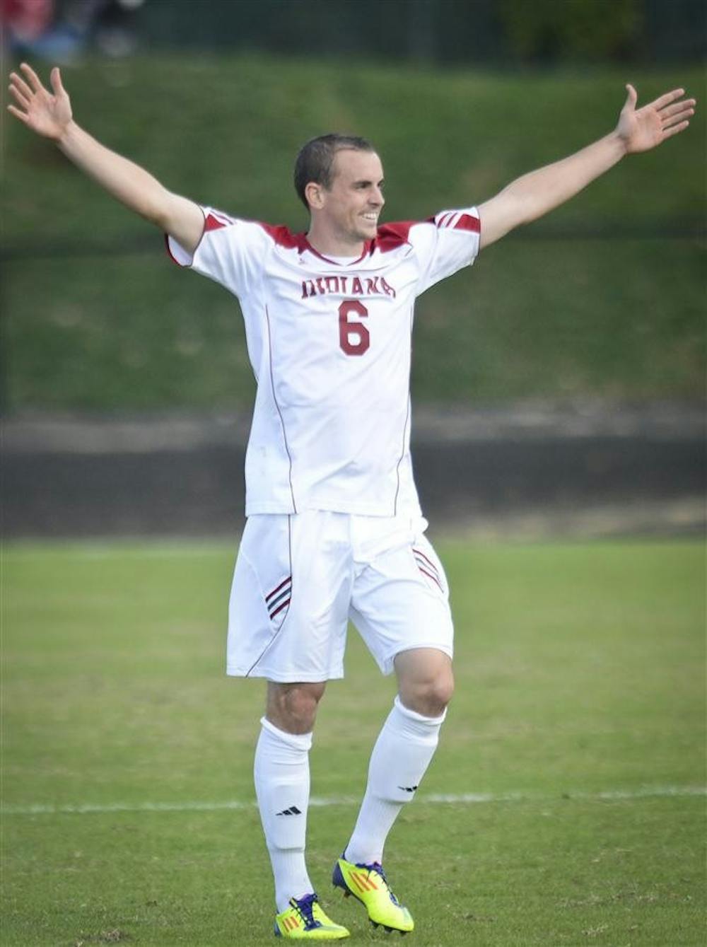 Senior defender Chris Estridge celebrates after a goal was scored by midfielder Jacob Bushue during the Hoosiers' 2-2 tie against Michigan State on Sunday at Jerry Yeagley Field. Steph Langan