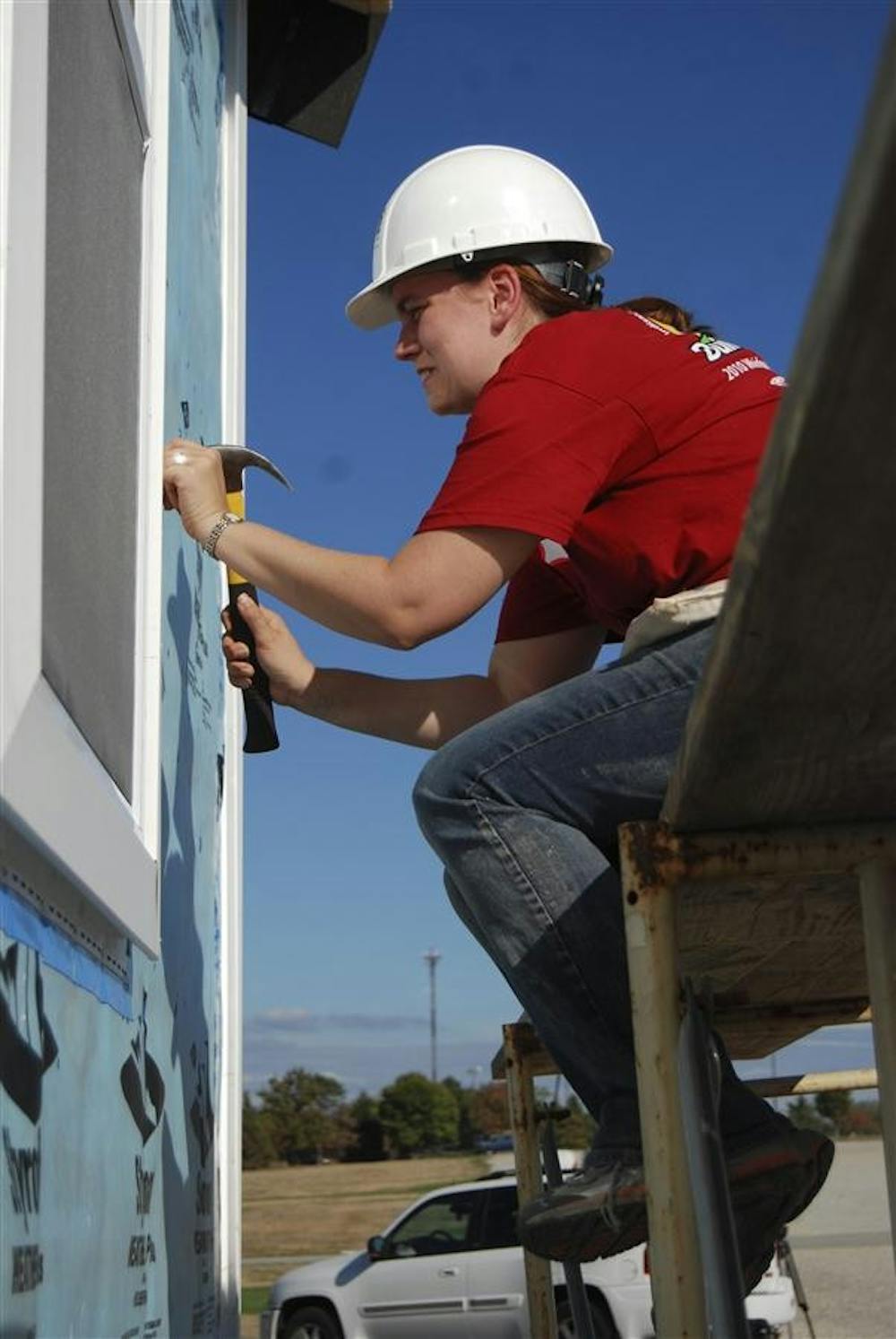 Patti Coil, a staff member with the Undergraduate Career Services office, hammers one of the day's last nails into the Monroe County Habitat House on Monday in the Memorial Stadium parking lot. Coil's Habitat for Humanity group is building a house for Trish Vosekas, who will receive the keys during Saturday's football game. The house will be driven to its permanent location Sunday morning.