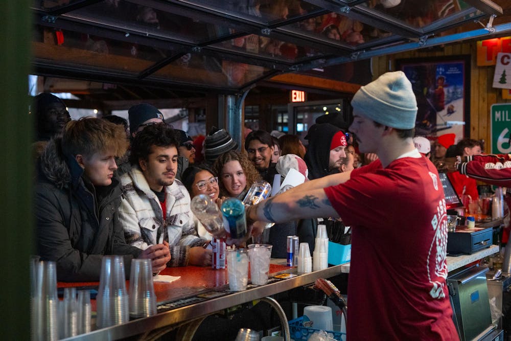 Bargoers watch a bartender make an AMF drink at 6:14 p.m. Jan. 19, 2026, inside the Upstairs Pub in Bloomington. There was still a line outside Upstairs around 6:20 p.m., more than 10 hours since the lines first started at 8 p.m. the night before.
