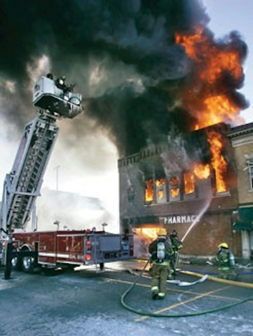 Firefighters battle a fire Monday, at Denny's Pharmacy in downtown Otterbein, Ind. The fire started around 12:30 p.m. when workers were thawing pipes beneath the pharmacy. Firefighters from seven departments responded to the blaze which destroyed the business. (AP Photo/Journal & Courier, John Terhune)