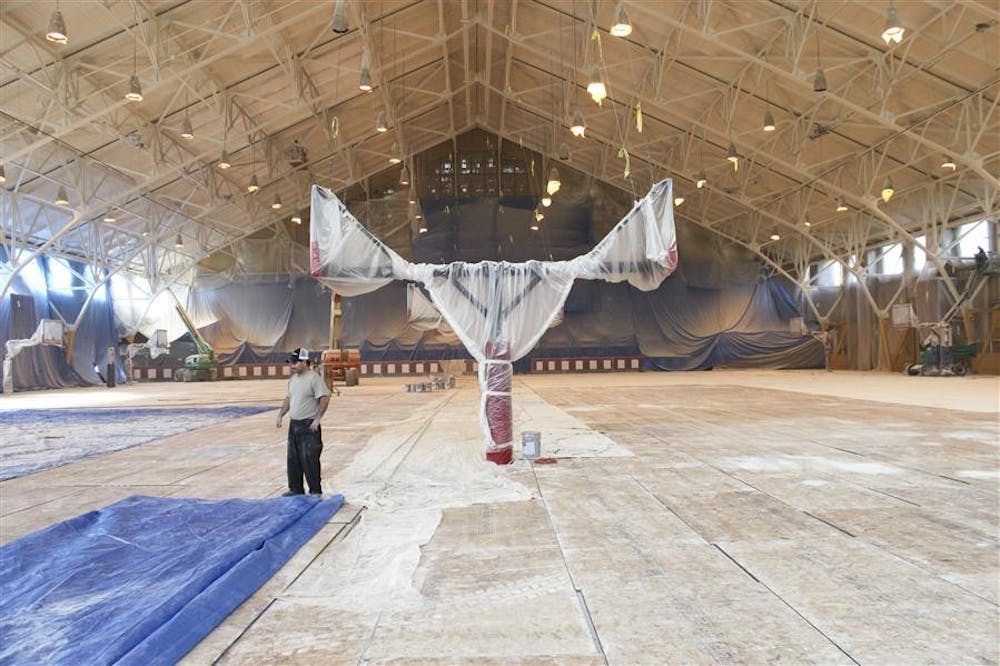 Construction workers work to rebuild the HPER gymnasium Tuesday. Jessica Contrera