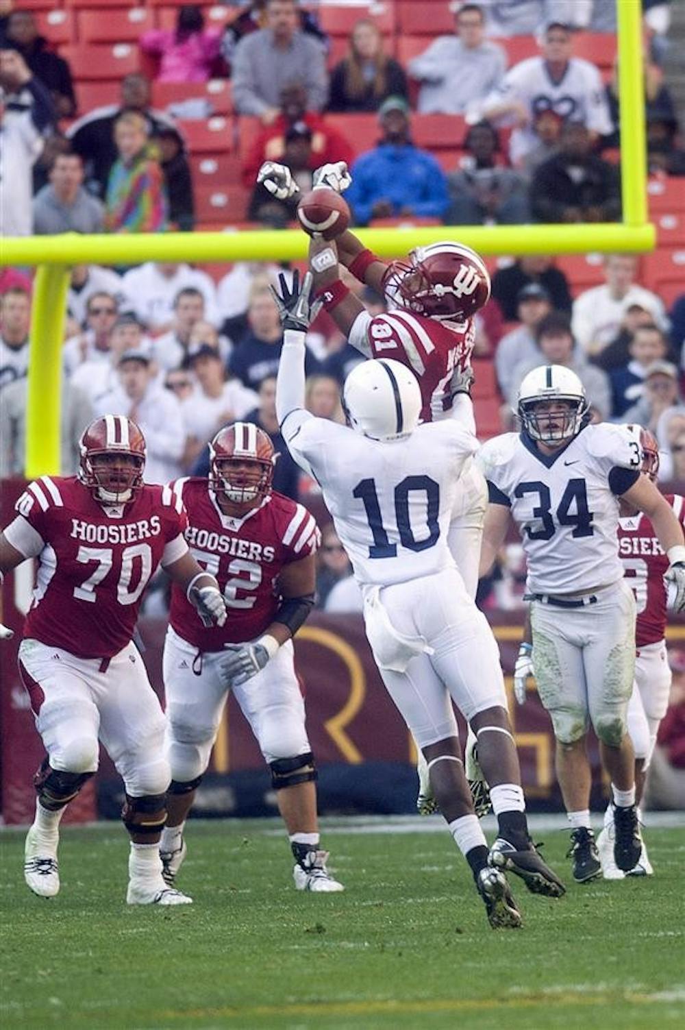 Freshman wide receiver Duwyce Wilson is unable to catch a pass from senior quarterback Ben Chappell, which was intercepted during IU's 41-24 loss to Penn State on Saturday at Fedex Field in Landover, Md. Peter Stevenson