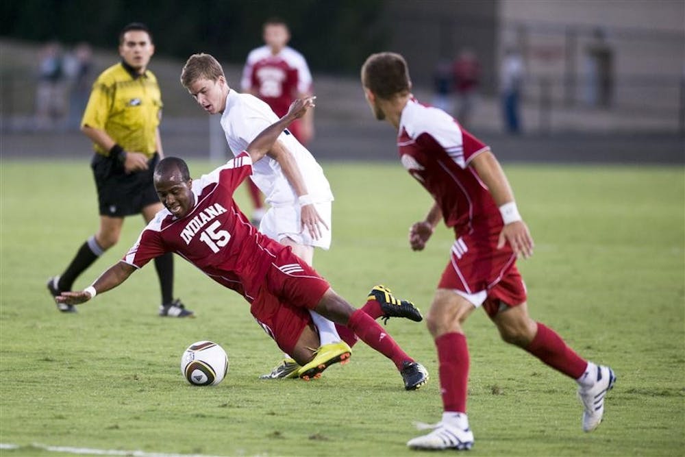 Senior midfielder Cameron Jordan is tackled during IU's 2-1 loss to Cal Friday at Bill Armstrong Stadium. Peter Stevenson