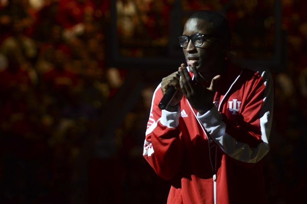 Victor Oladipo sings to the crowd during Hoosier Hysteria on Saturday at Assembly Hall. Later, the entire team did a dance together for spectators. Steph Langan