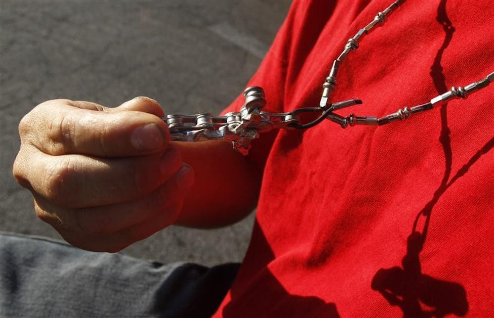 Gustabo Meza shows off his homemade crucifixion necklace made from a bike chain on Friday at The Chocolate Moose. Mark Felix