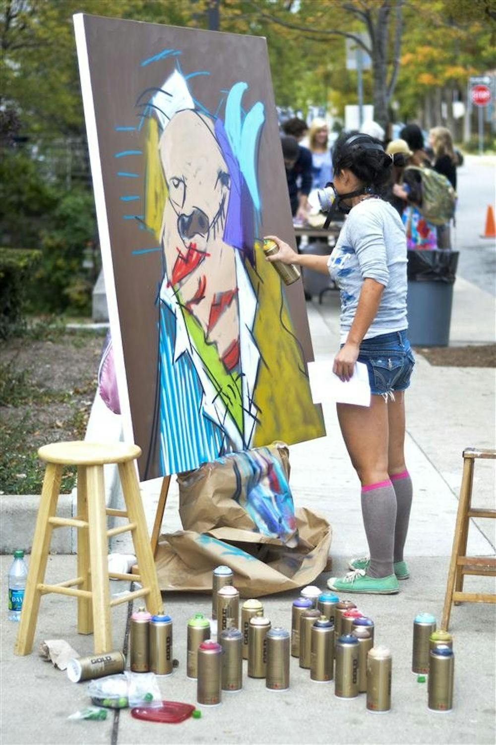 Master of fine arts painting student Feng Liu uses an array of colored spray paint to create a different paintings throughout the evening Friday at the Friends of Art Block Party downtown. There were many different demonstrations and a musical performance by the local Bloomington band Sleeping Bag at the event as well.