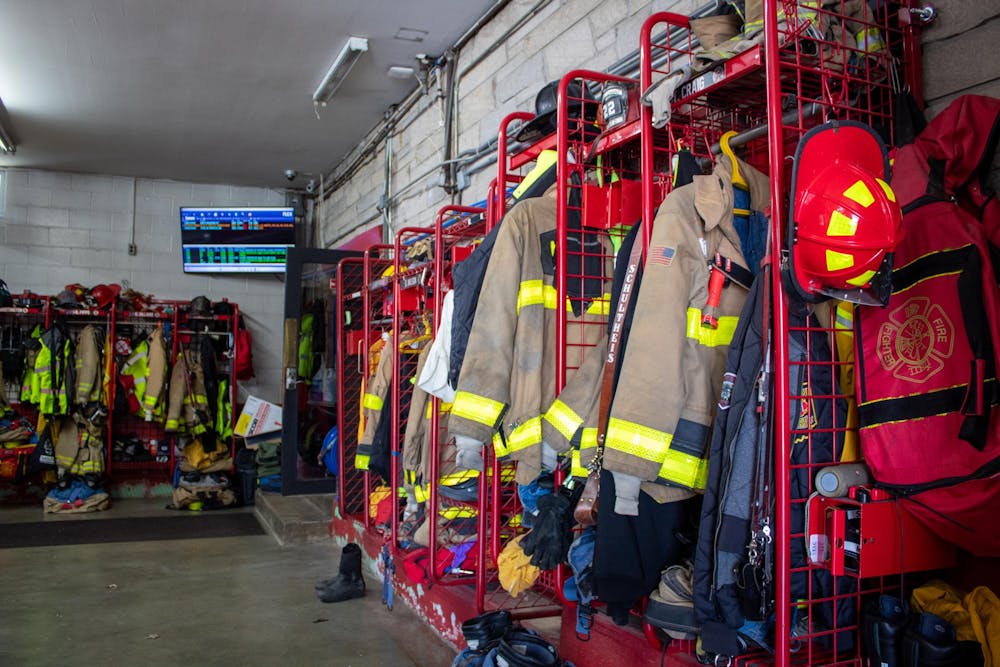 Fire suits hang around the perimeter of the garage April 1, 2025, at Station 22 in Bloomington. The MFD said it is comprised of both career and volunteer firefighters.