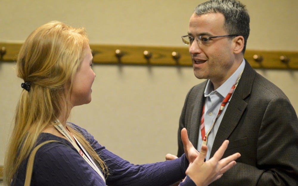 Senior Rebecca Whitaker discusses a potential future in Law with Federal Trade Commission Attorney Jim Trilling during the Connect 17 networking conference hosted by the Walter Center for Career Achievement Friday afternoon in The IMU Tree Suites.