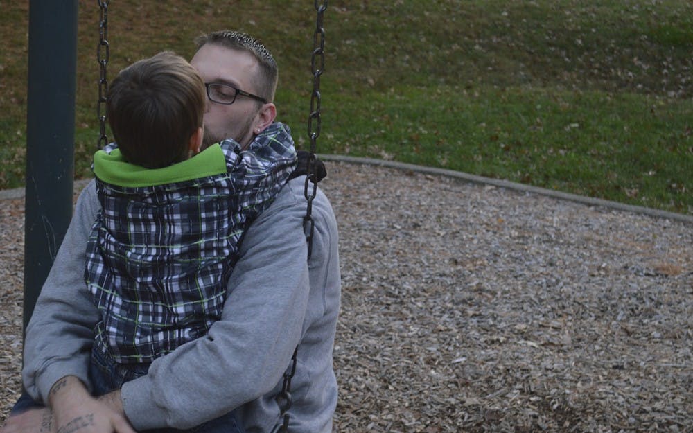 TJ Covey kisses his youngest son, Jaxon, while swinging at the park in early November 2016. Covey takes advantage of every moment that he has with his kids.